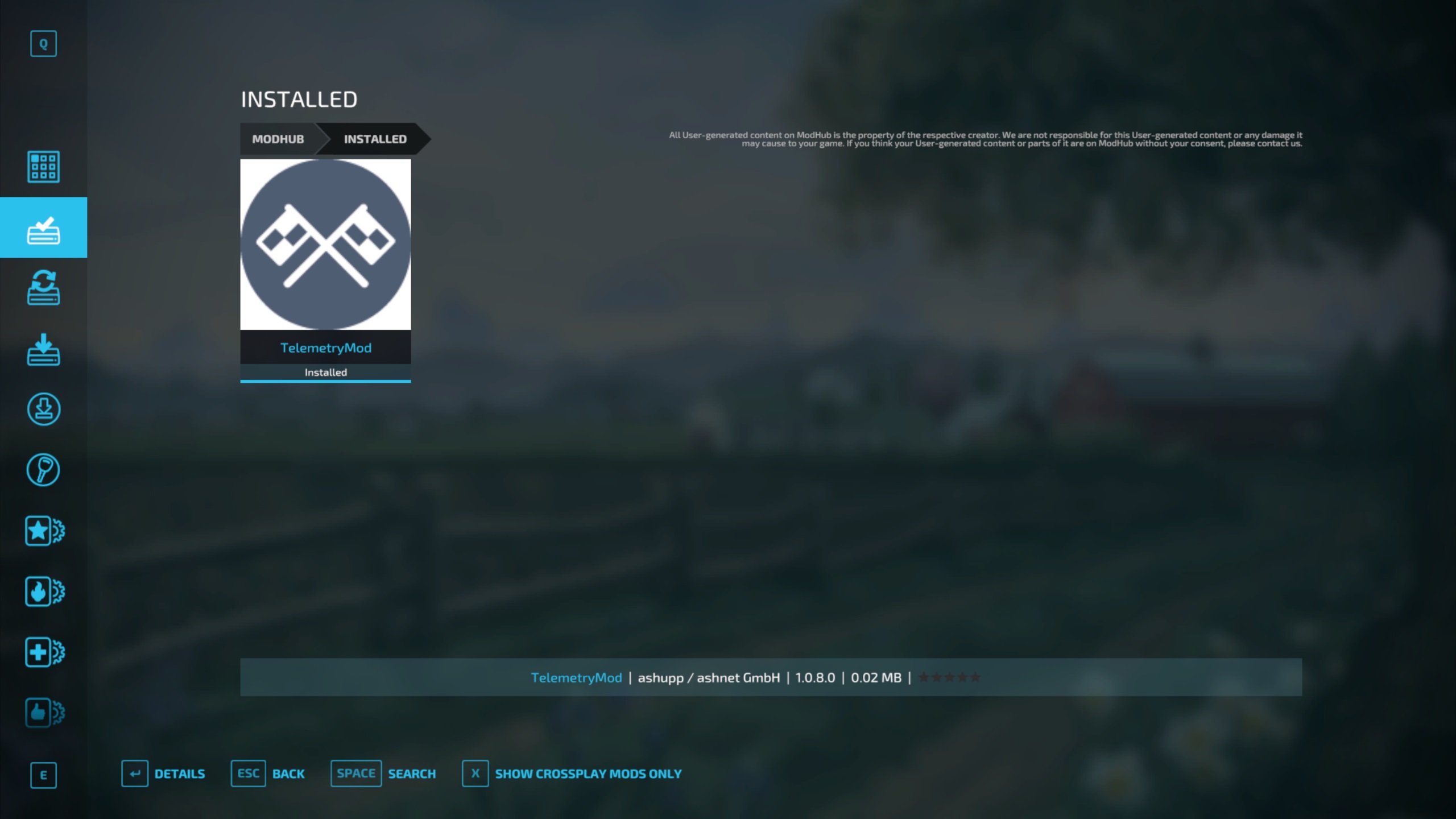 8.Select INSTALLED. The TelemetryMod should appear in the ModHub as the image below. If the TelemetryMod is not in the INSTALLED folder, please close Farming Simulator 22 and go to the GAMES > PC tab and click the CONFIG button.